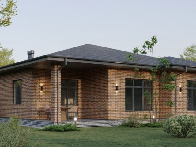 Проект современного одноэтажного загородного дома "Кравцово" с сауной, террасой-барбекю и навесом для двух автомобилей. Площадь дома - 324,95 кв.м.