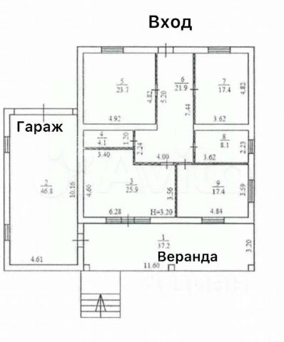 Продажа одноэтажного дома с мансардой, без внутренней отделки, площадью 202,5 кв.м, расположенного на участке 10 соток. Деревня Клеймёново, квартал "А". Расстояние от МКАД 85 км, от города Серпухов 18 км. Техническая характеристика дома: фундамент - ленточный с монолитной плитой стены - керамзитный блок, минеральная вата, фасадная панель Docke. крыша - профлист окна - "Rehau", двойные тонированные стеклопакеты. Планировка: прихожая (21,9 кв.м), кухня-гостиная (25,9 кв.м), три жилые комнаты (23,7+17,4+17,4 кв.м), санузел, техническая комната, мансардный этаж, терраса (37,2 кв.м). Гараж на 2 м/места (46,8 кв.м). Коммуникации: электричество 15 кВт, 3 фазы, канализация (септик), водоснабжение (скважина, глубиной 65 м). Коммуникации заведены в дом. Категория земель: земли с/х назначения, вид разрешенного использования: для дачного строительства. Хорошая транспортная доступность, дорога к поселку асфальтирована. Река Нара на расстоянии 700 м. Арт. 127443673
