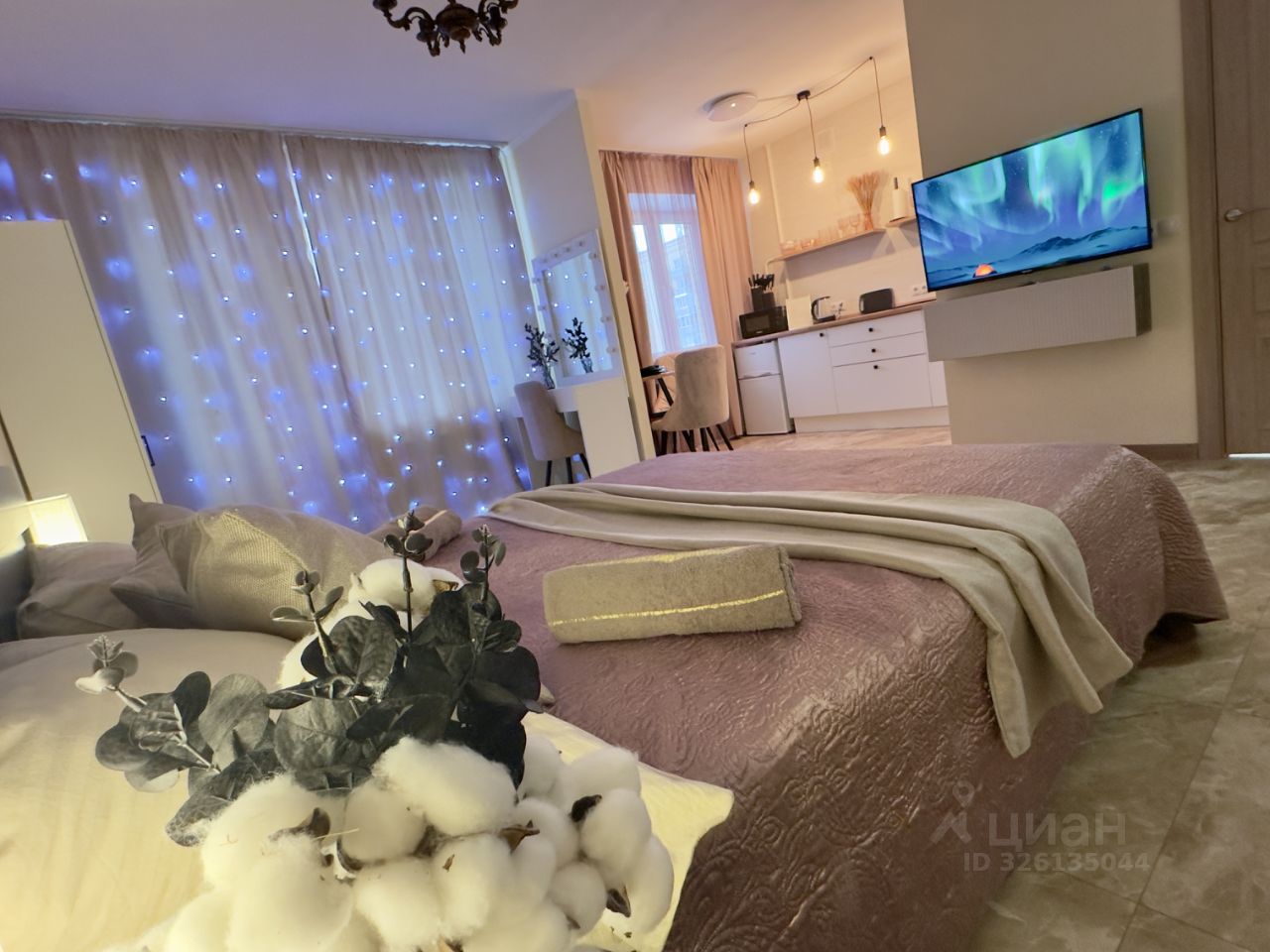 Бытовая техника: холодильник, микроволновка, стиральная машинка, smart тв, фен, утюг, постельное белье, полотенца, принадлежности для душа. Двуспальная кровать и раскладной мини диван.
