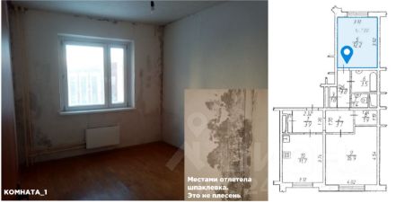 Ремонт от застройщика, поэтому частично требуется обновление. Прекрасная возможность сделать дизайн на свой вкус и не переплачивать за чужой ремонт. Плесени нет (на фото видно, где местами отлетела шпаклевка при проведении демонтажных работ - снятии муниципальных обоев)!