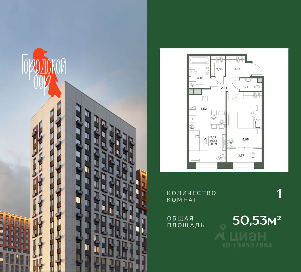 Продается 1-комн. квартира, 50,53 м²