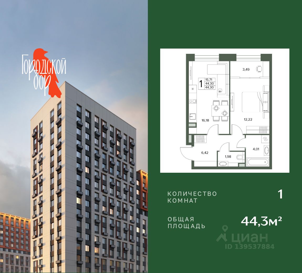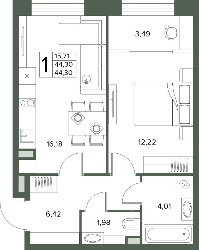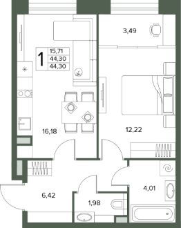 Общая площадь44,3 м²