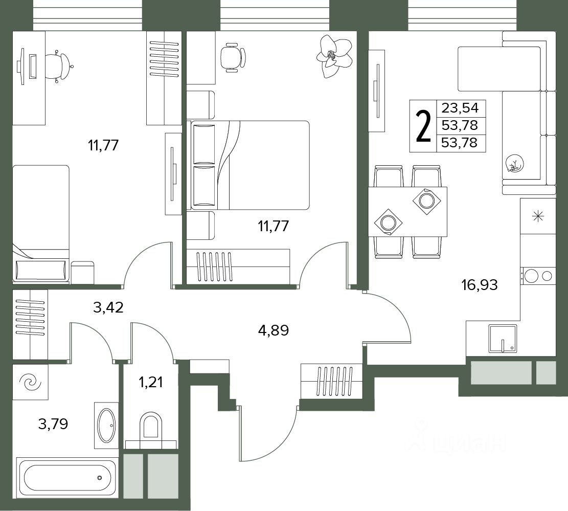 Общая площадь53,78 м²